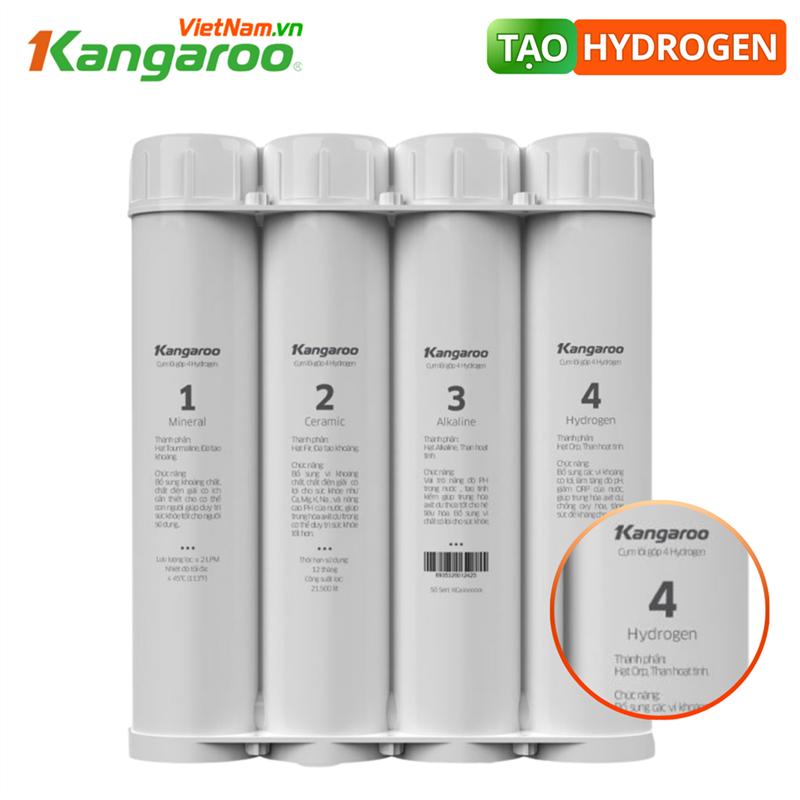 Thông tin sản phẩm Bộ 4 lõi tạo Hydrogen Kangaroo: Mineral, Ceramic, Alkaline, Hydrogen
