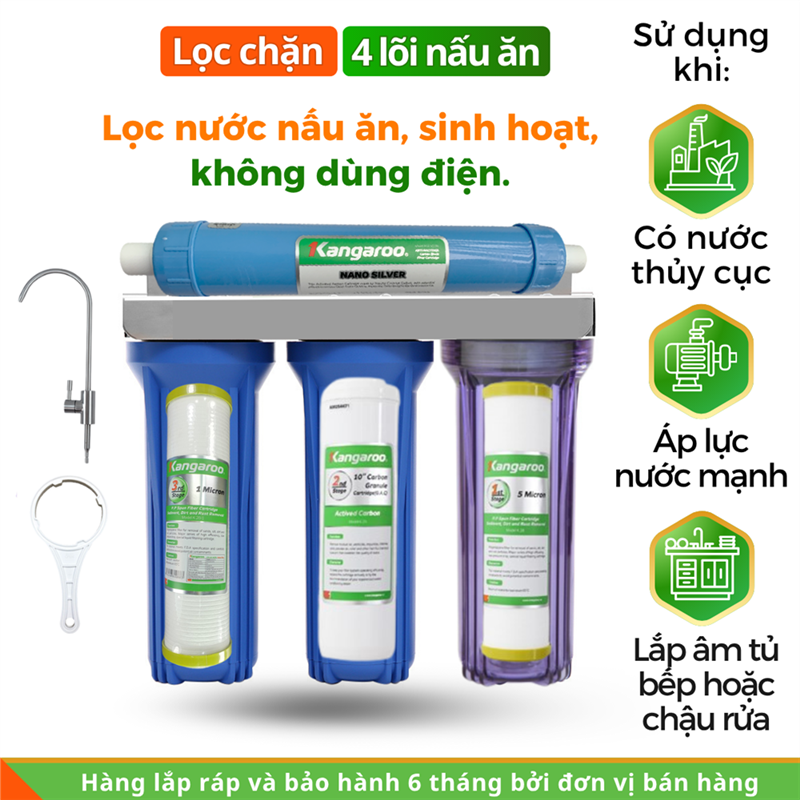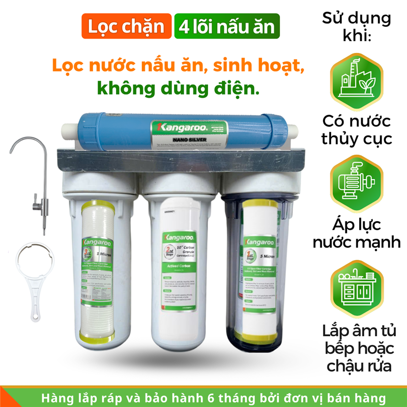 Bộ lọc chặn 4 lõi là giải pháp lọc nước sinh hoạt – nấu ăn hiệu quả, kinh tế và bền bỉ, phù hợp với gần như mọi gia đình Việt Nam. Với 4 cấp lọc kết hợp Nano Silver, bộ lọc giúp loại bỏ cặn bẩn, kim loại nặng, mùi clo, đồng thời tạo khoáng và diệt khuẩn, mang đến nguồn nước sạch – an toàn – ngon hơn cho cả nhà.