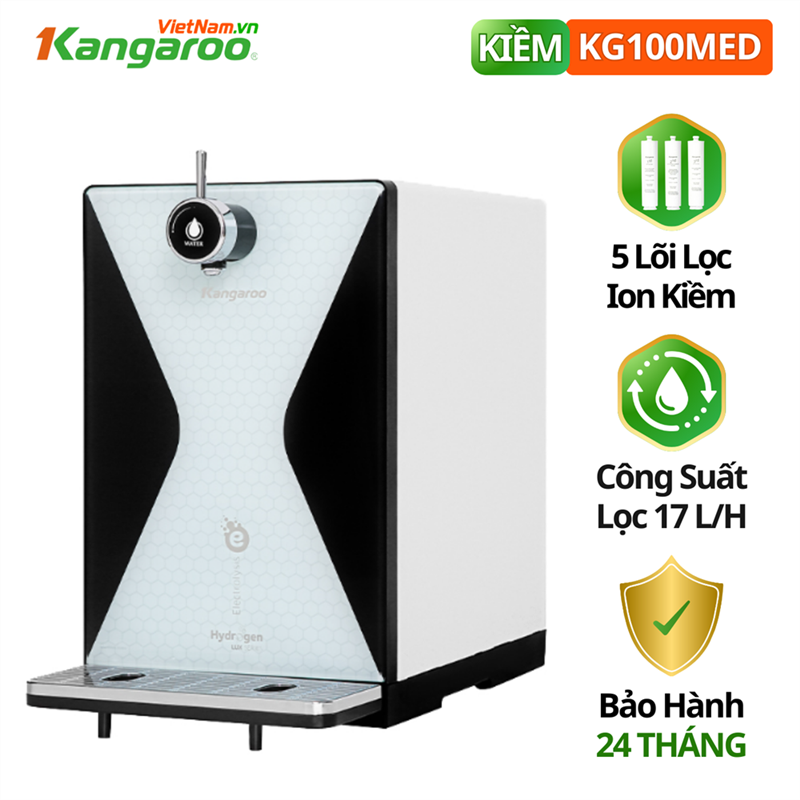 [TẠM HẾT HÀNG MIỀN BẮC] KANGAROO HYDROGEN ION KIỀM KG100MED: - Thiết kế nhỏ gọn, cao cấp, sang trọng - Giảm đến 65% kích thước - Vòi cơ đóng, mở liền máy hoàn toàn khác biệt - Công nghệ điện phân nước RO đầu tiên và duy nhất tại Việt Nam, đem lại dòng nước hydrogen ion kiểm tốt nhất. - Bảo hành chính hãng 24 tháng