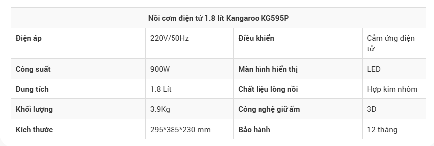 Thông tin sản phẩm Nồi cơm điện tử Kangaroo 1.8 lít KG595P